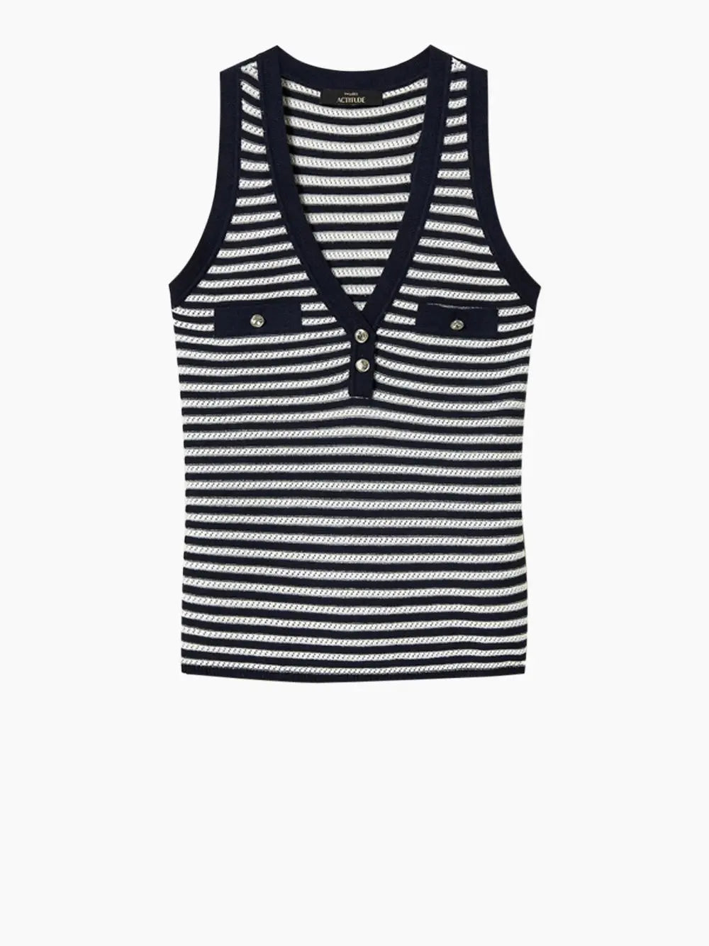 Il Top Donna di Actitude, codice 251AP3021, unisce eleganza e stile in un capo unico. Realizzato in cotone a righe con dettagli in lurex, presenta bottoni gioiello, uno scollo a V profondo e finti taschini adornati. Perfetto per chi cerca un look deciso e alla moda, si distingue per la sua linea fitted che esalta la silhouette.