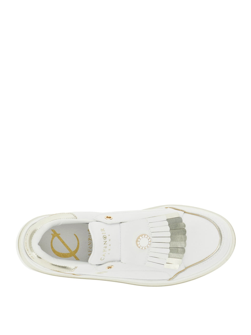 Le sneakers donna C1DS1006 di CafèNoir combinano eleganza e comfort in un design moderno. Realizzate in pelle rivestita e impreziosite da un dettaglio di frange, queste sneaker in bianco con accenti dorati sono ideali per chi cerca uno stile casual ma chic. Perfette per un look che cattura l'attenzione senza rinunciare al comfort.