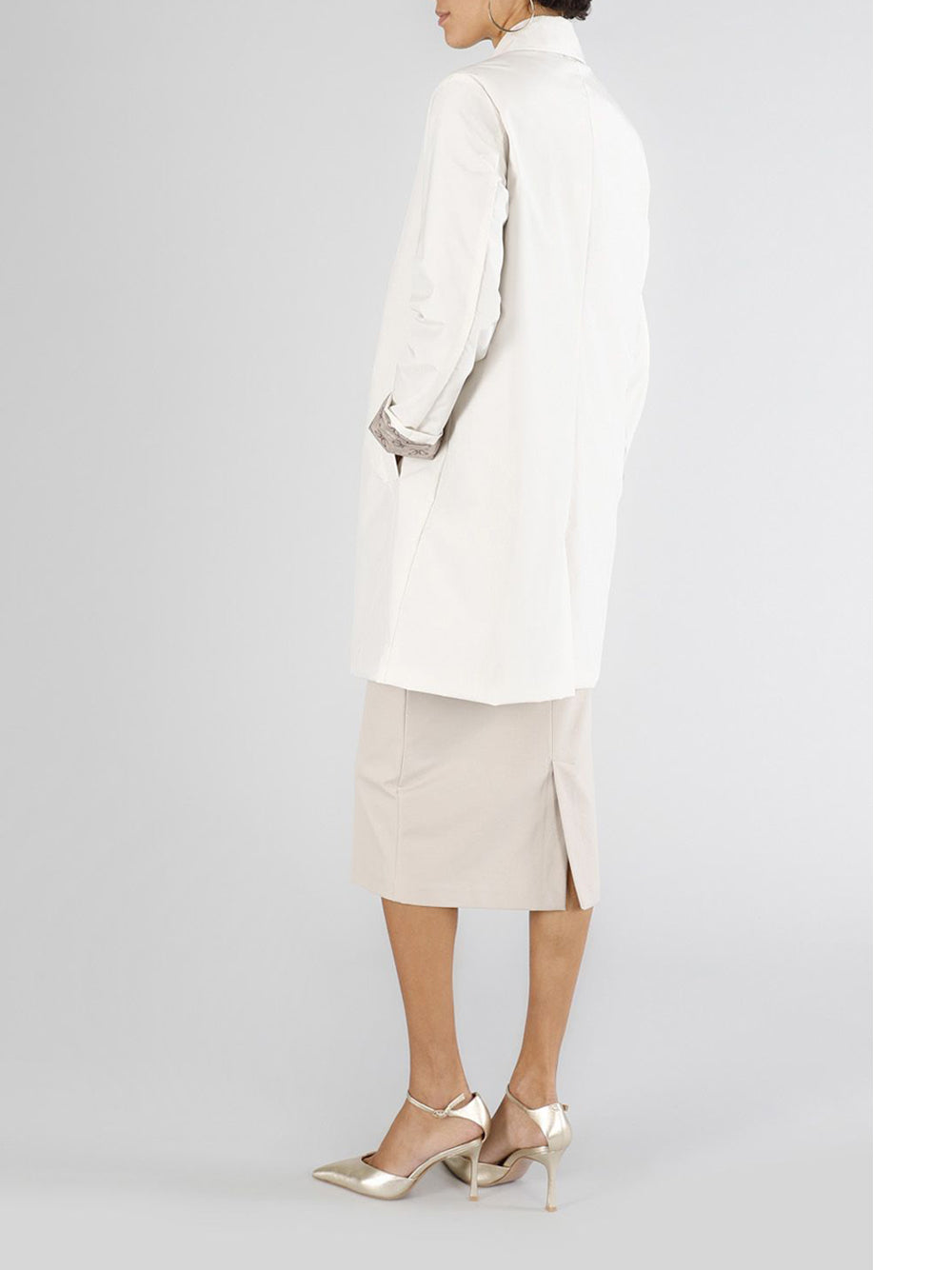 - Spolverino lungo monopetto realizzato in tessuto tecnico con fodera stampata