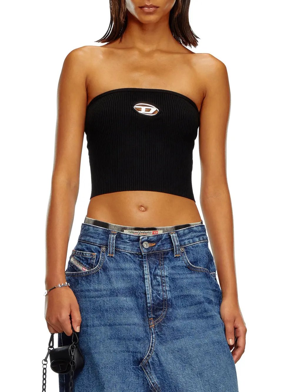 Il Top MClarksvillex di Diesel è realizzato per la donna che ama esprimere il suo stile con un tocco di audacia. Questo top nero, versatile e contemporaneo, si distingue per il dettaglio della placca ovale in metallo inserita nel cut-out sul petto, che aggiunge una nota di sensualità. La costruzione in jersey a costine elasticizzate garantisce una vestibilità morbida e aderente.