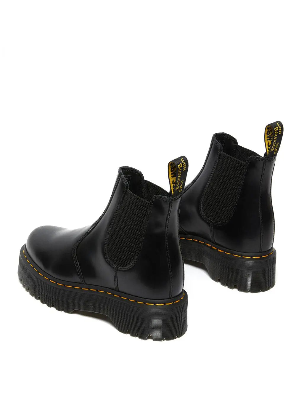 Stivaletto Dr. Martens 2976 Quad da Donna, modello Chelsea, senza lacci, caratterizzato da elastici laterali che offrono una calzata comoda e facile. La suola in gomma spessa, con un'altezza di 4,7 cm, conferisce un aspetto audace e un comfort aggiuntivo. Le cuciture gialle distintive, insieme all'asola con logo sul retro, rimandano all'estetica iconica di Dr. Martens. Realizzato al 100% in pelle, questo stivaletto rappresenta un connubio di qualità e stile. Scegli l'originalità senza compromessi con il Stivaletto Dr. Martens 2976 Quad, perfetto per aggiungere carattere distintivo al tuo look.
