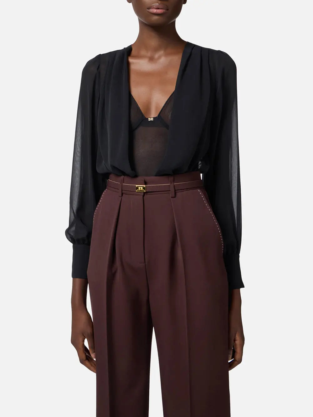 Il body donna di Elisabetta Franchi, nero, è l'epitome di eleganza e sofisticazione. Realizzato con una combinazione di tulle e una parte superiore in georgette di seta, questo capo presenta un design unico che unisce stile e comfort. I dettagli drappeggiati e il logo con strass aggiungono un tocco distintivo, perfetto per ogni occasione.