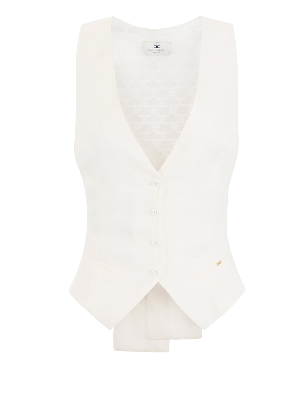 Il gilet donna GL00552E2 di Elisabetta Franchi è un capo elegante e raffinato, perfetto per arricchire il guardaroba di qualsiasi donna. Realizzato in gabardina di misto lino, questo gilet avorio presenta un elastico e una fusciacca da annodare sul retro, oltre a bottoni in tono e un dettaglio in metallo dorato con logo impreziosito da strass.