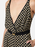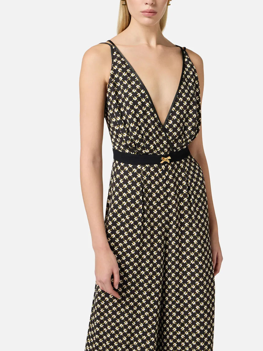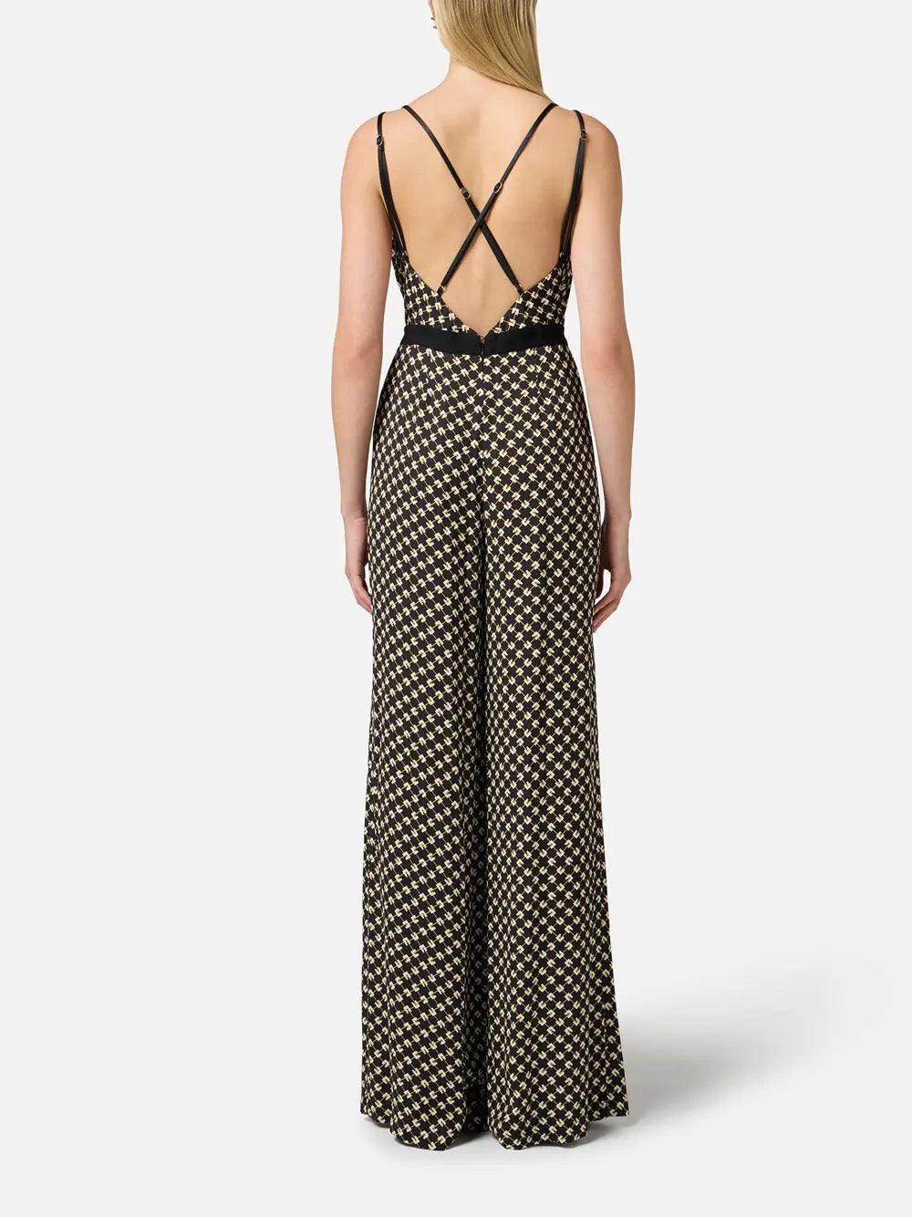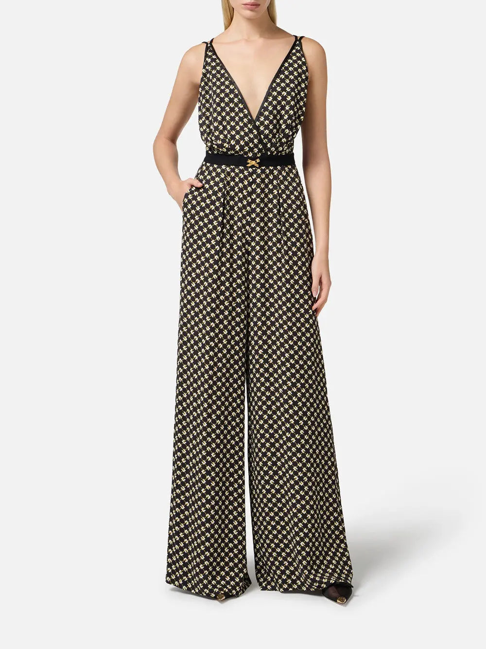 La jumpsuit donna TU03551E2 di Elisabetta Franchi è un capo lussuoso ed elegante realizzato in georgette. Presenta uno scollo a portafogli e pantaloni a palazzo, impreziosita da un motivo a rombi all-over. La cintura con fiocco gioiello enfatizza la silhouette femminile, donando un tocco di raffinata femminilità.
