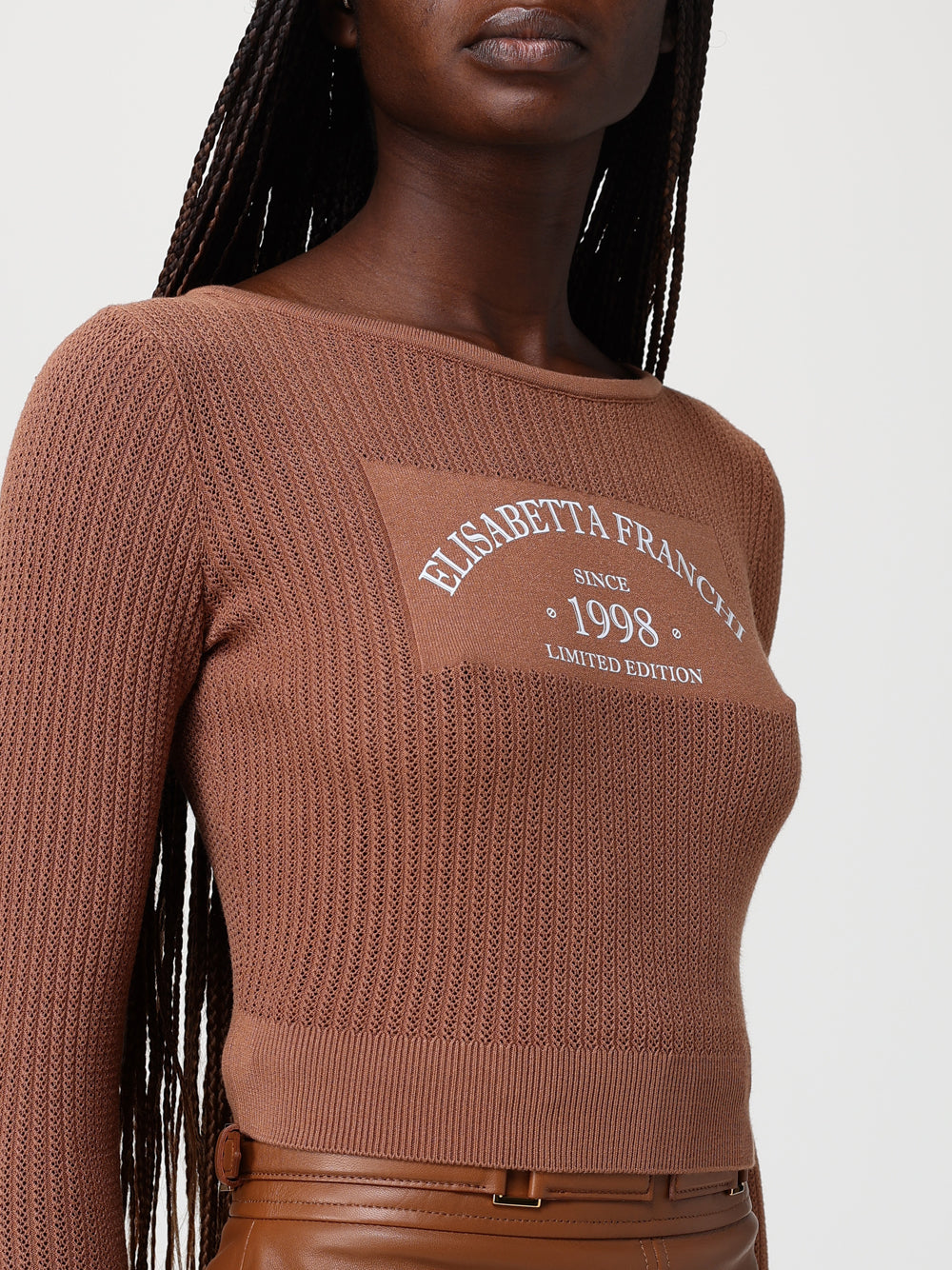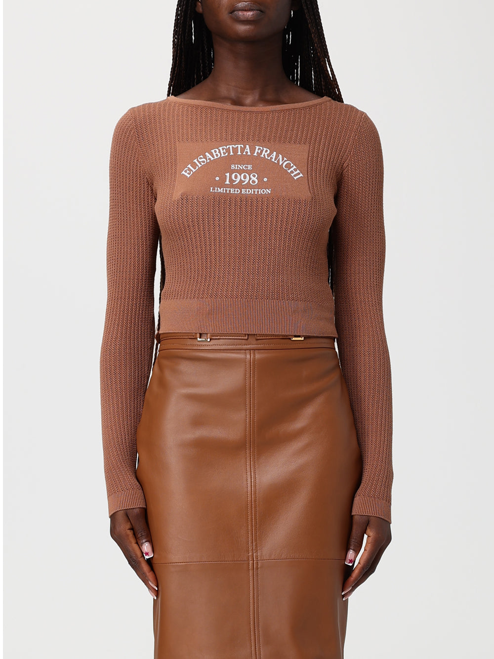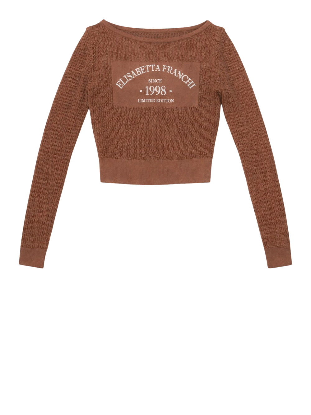 La maglia cuoio donna di Elisabetta Franchi è un elegante top in maglia caratterizzato da un ampio scollo e maniche lunghe. La lavorazione a costine e le traforature aggiungono un tocco raffinato, mentre il logo stampato sul tessuto rasato completa il design. Una maglia pensata per chi ama uno stile chic e femminile.