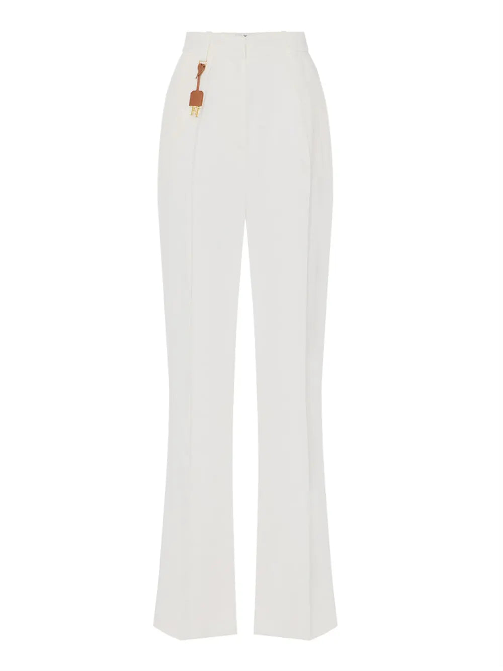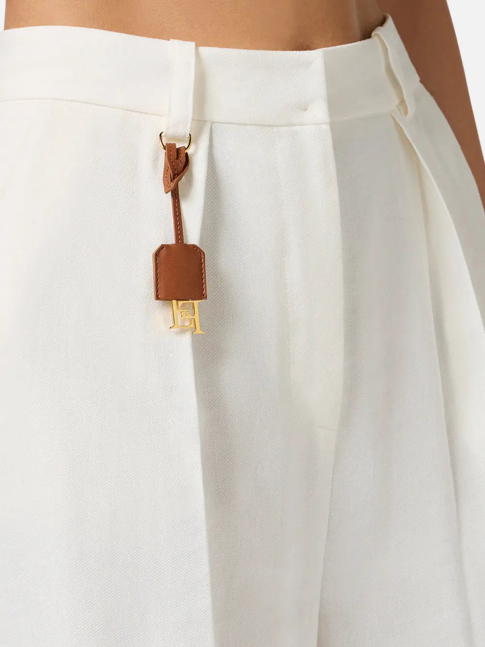 Esplora l'eleganza senza tempo con il Pantalone Palazzo Donna PA09752E2 di Elisabetta Franchi, in avorio. Confezionato in un moderno gabardina di misto lino, questo capo fonde stile e comfort in ogni dettaglio, caratterizzato da pinces e un accessorio logo pendente, per un look sofisticato e femminile.