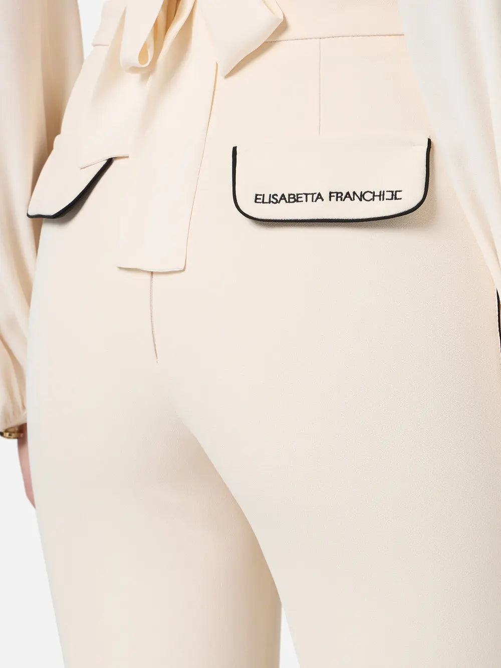 Il pantalone a zampa Elisabetta Franchi è un capo esclusivo dalla personalità decisa e uno stile chic. Realizzato in crêpe stretch leggero, abbina eleganza e praticità grazie ai dettagli di piping a contrasto e al logo ricamato sul retro. La tonalità Burro/Nero conferisce ulteriore sofisticatezza a un must per il guardaroba femminile contemporaneo.