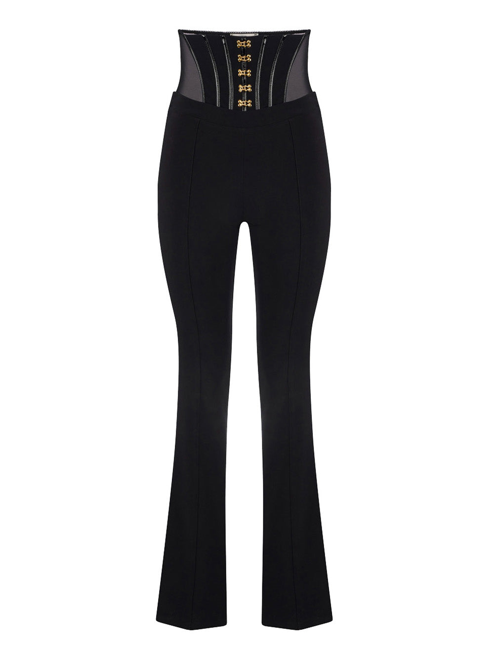 Scopri i pantaloni a zampa di Elisabetta Franchi, una straordinaria combinazione di stile e comfort. Realizzati in crêpe leggero, offrono una vestibilità aderente con una gamba svasata che esalta la silhouette. La vita alta è arricchita da dettagli come stecche interne e luminosi accenti in vinile, perfetti per un look elegante e sofisticato.