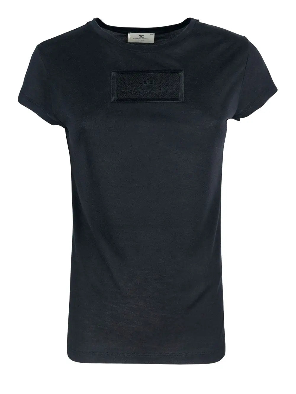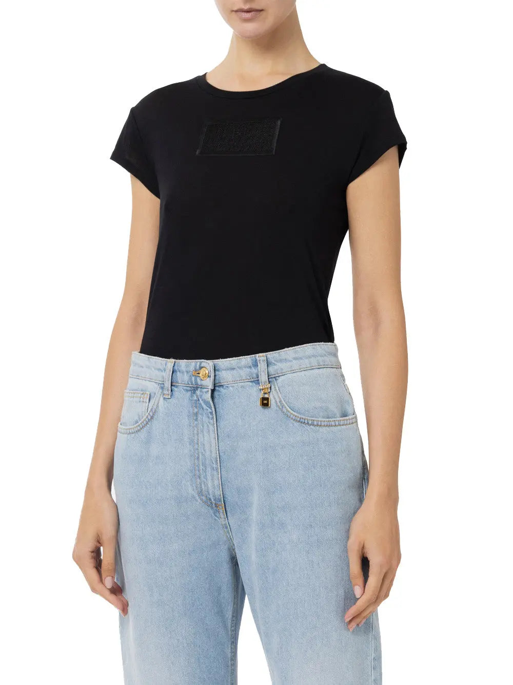 La t-shirt donna MA00451E2 di Elisabetta Franchi è l'epitome del design raffinato e moderno. Realizzata in jersey di modal, presenta eleganti spalle ad aletta, una vestibilità slim e un esclusivo patch traforato e ricamato con logo. Questo capo unisce comfort e carattere, perfetto per chi ama un look sofisticato e contemporaneo.