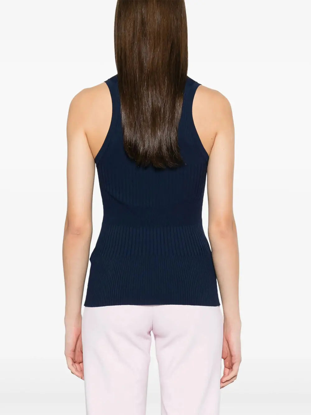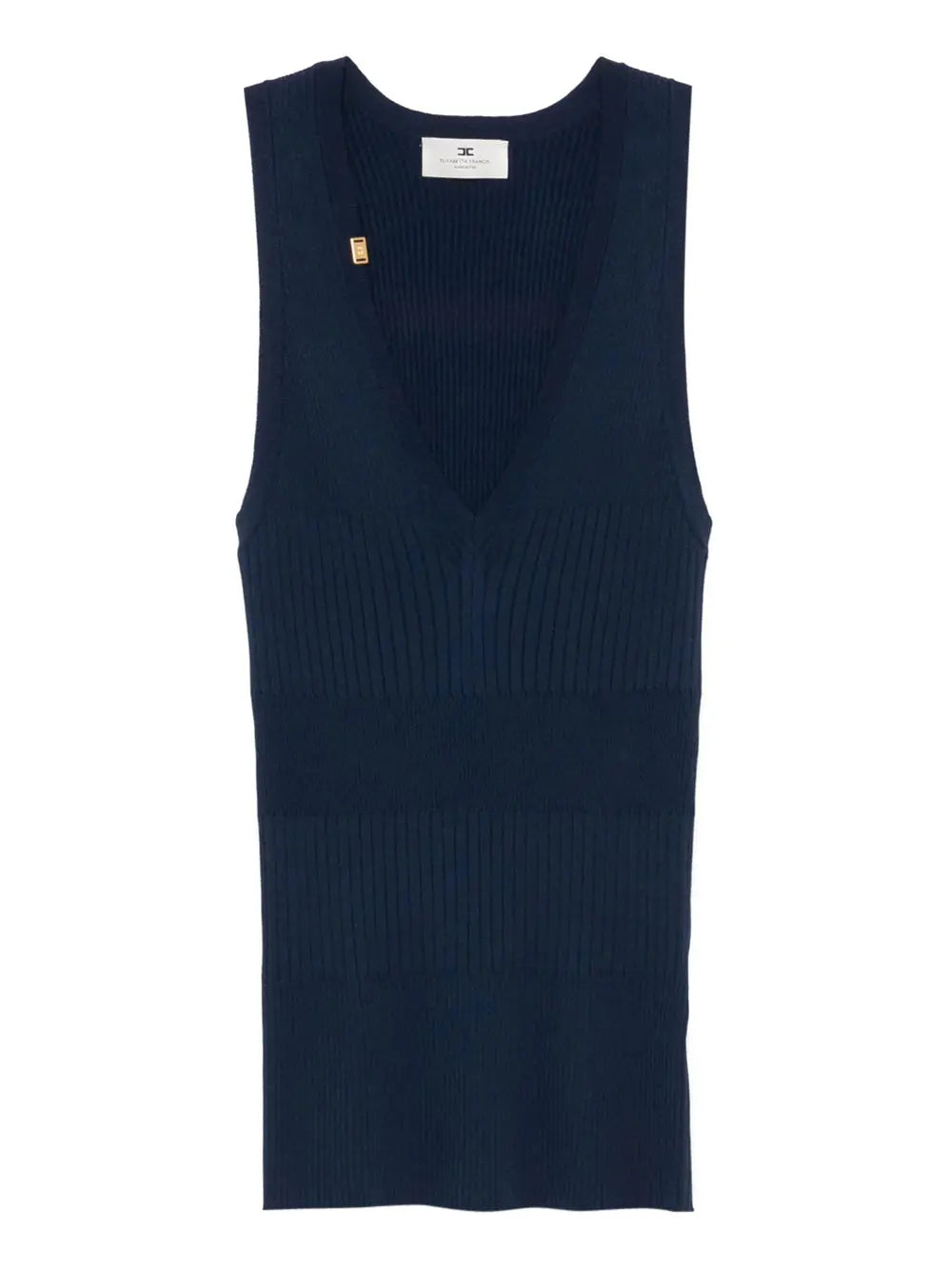 Il Top Donna TK35T51E2 in colore Oltremare di Elisabetta Franchi è un capo essenziale per arricchire il tuo guardaroba. Questo top smanicato è caratterizzato da una lavorazione a coste sfalsate e uno scollo a V, impreziosito da una piccola placca in metallo dorato con logo, donando un tocco di eleganza e modernità al tuo stile.