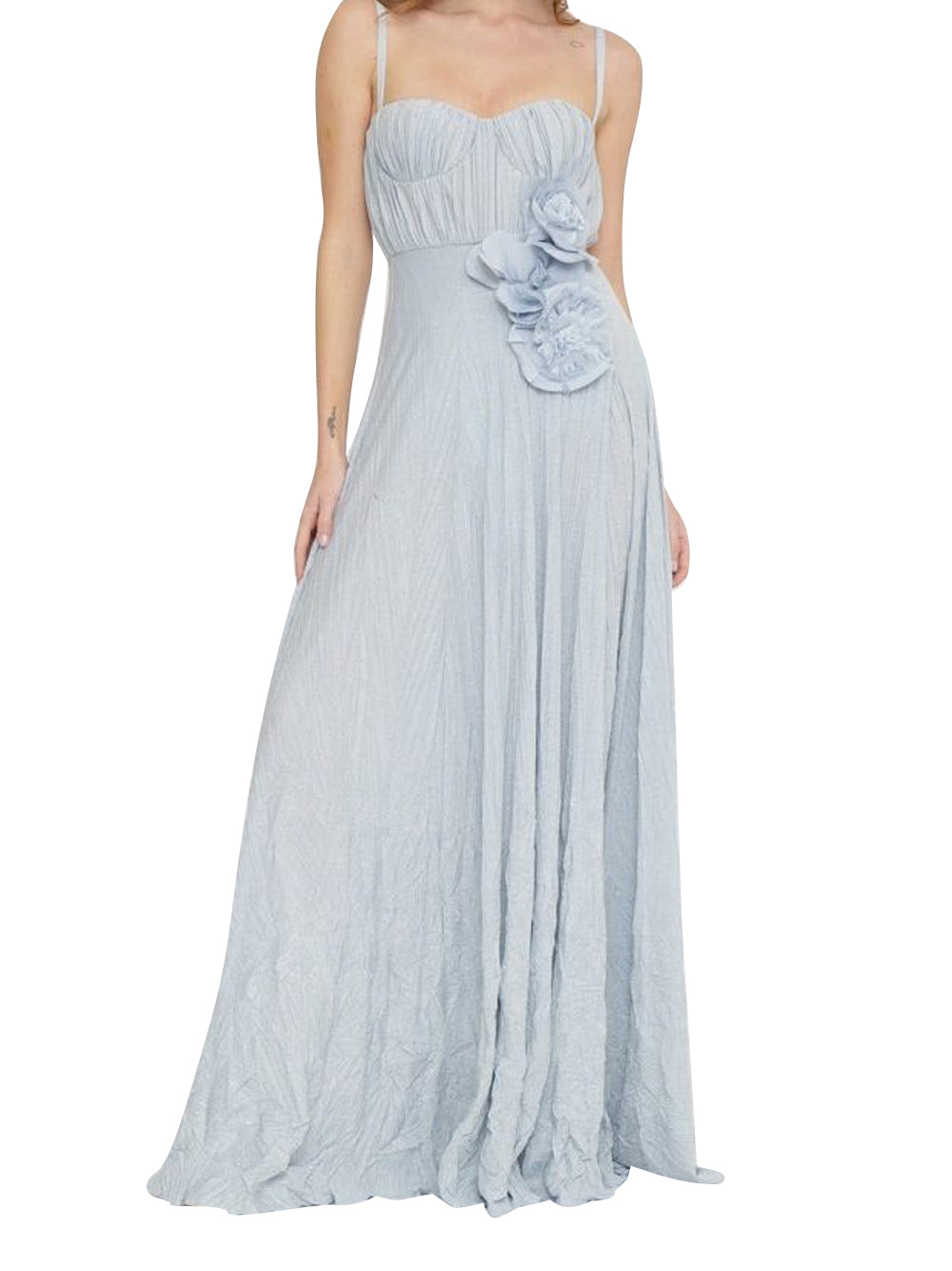 Il vestito longuette Sky Blue di Elisabetta Franchi è un capolavoro di design, perfetto per occasioni serali e speciali. Questo abito raffinato offre una silhouette elegante con spalline sottili e coppe sul busto, arricchito da un ricamo floreale su un fianco e una texture stropicciata, che aggiunge un tocco di sofisticatezza.