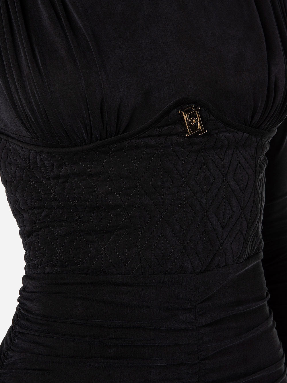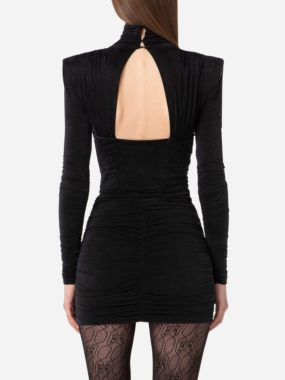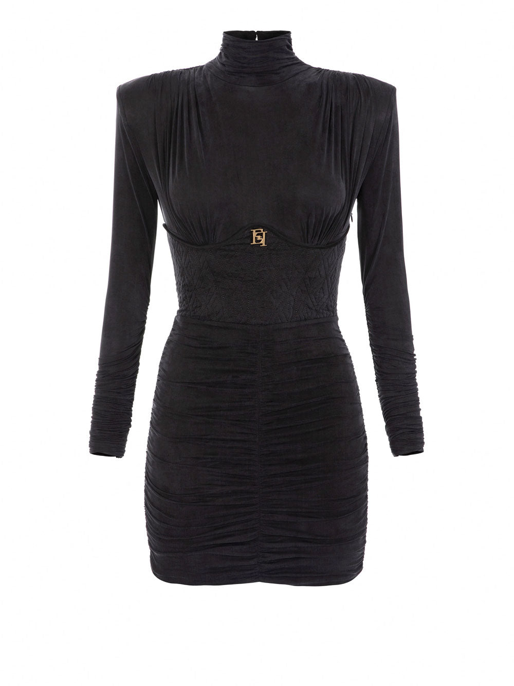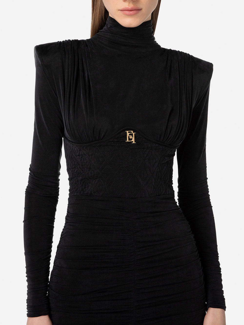 Lasciati conquistare dal elegantissimo vestito Elisabetta Franchi da donna, in jersey cupro, elastico, bustier con ricamo a rombi, collo alto, a maniche lunghe arricciate, logo metallico dorato al centro del petto, zip invisibile sul fianco, scollo sul retro chiuso con bottone, spalline imbottite. 92% Cupro, 8% Elastane