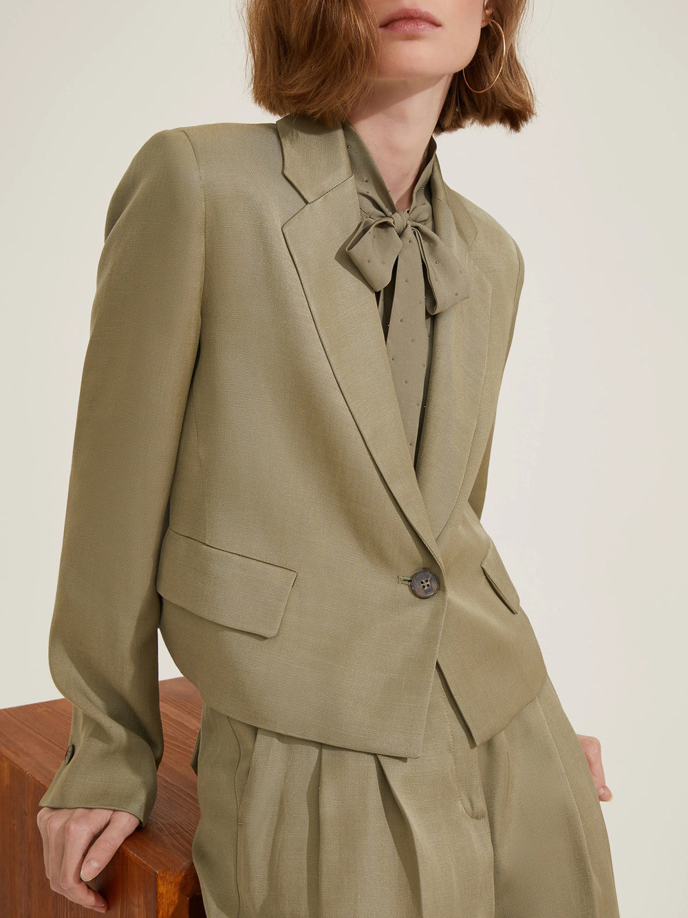 La giacca Salvia di Emme Marella è un capo essenziale per il guardaroba femminile. Realizzata in un raffinato blend di lino e viscosa, questa giacca presenta un design corto e femminile, perfetto per creare abbinamenti versatili. Il suo colore kaki conferisce un tocco contemporaneo, rendendola adatta sia per occasioni formali che informali.