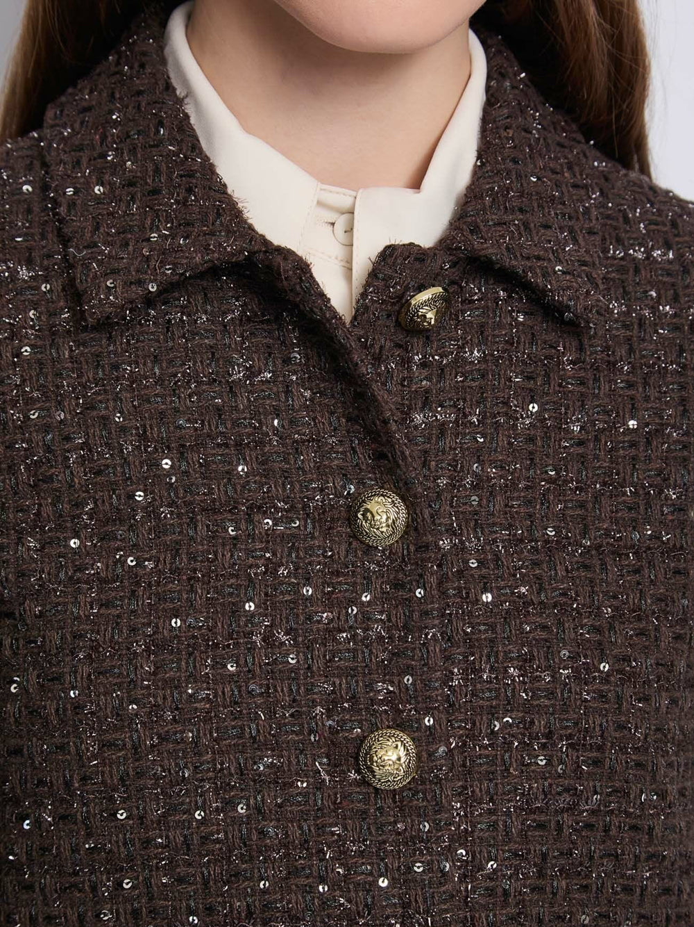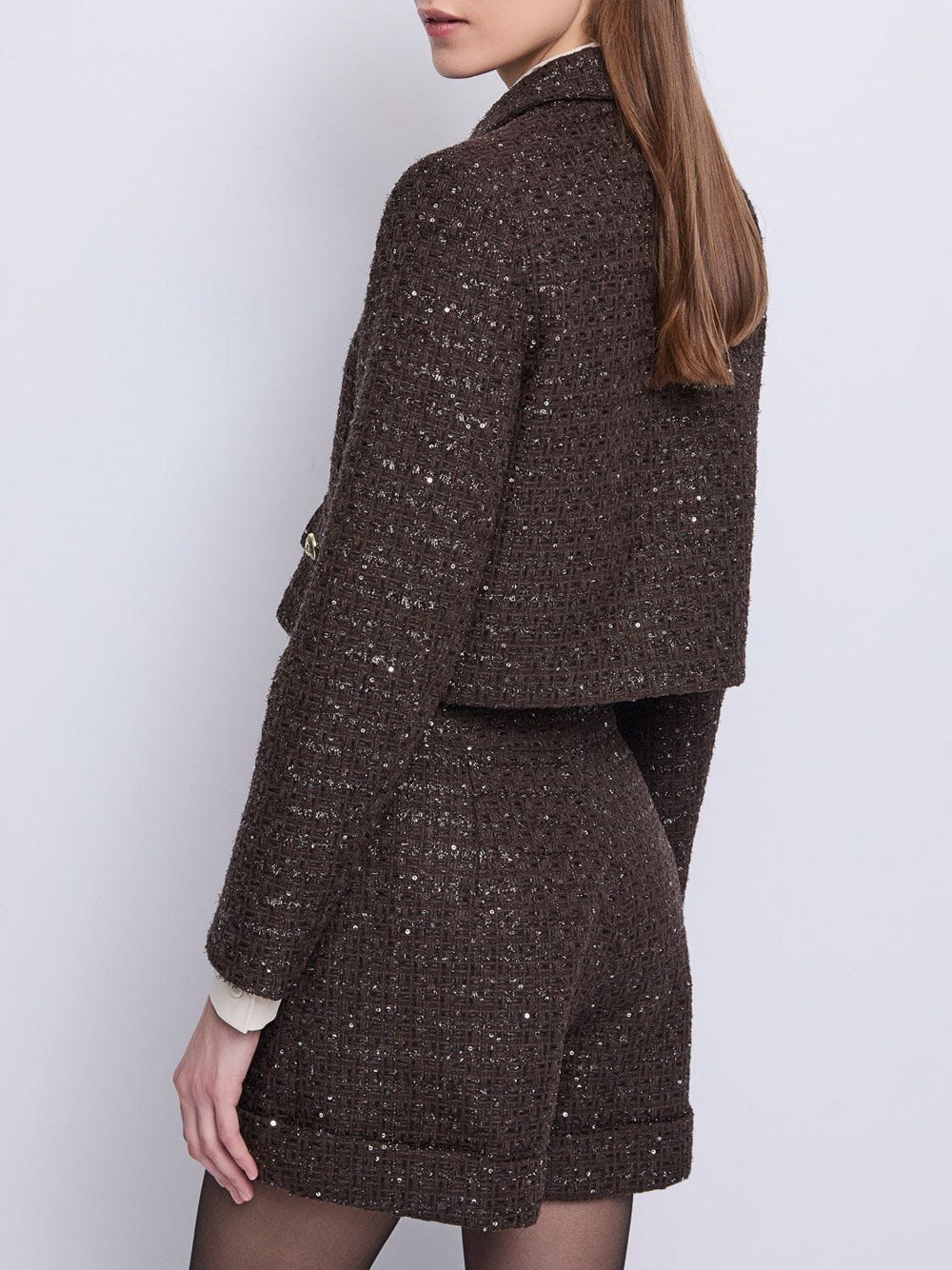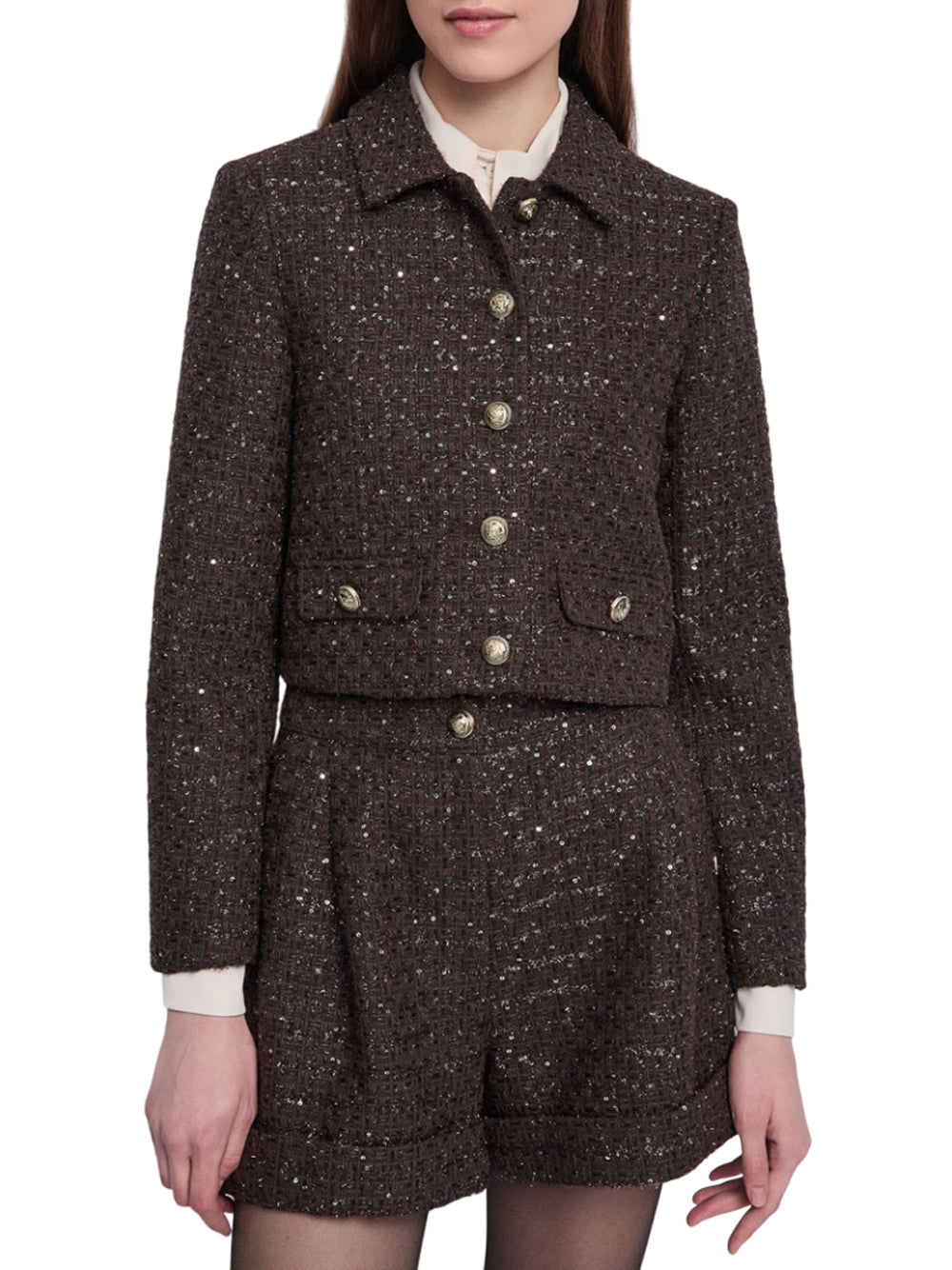 La giacca "Chocolate Plum" di Gaudi è un capo di abbigliamento femminile, perfetto per chi desidera distinguersi con eleganza. Realizzata in bouclé di misto lana e impreziosita da dettagli di lurex e paillettes, questa giacca offre un tocco glamour grazie ai suoi bottoni dorati. Ideale per un look luminoso e sofisticato.