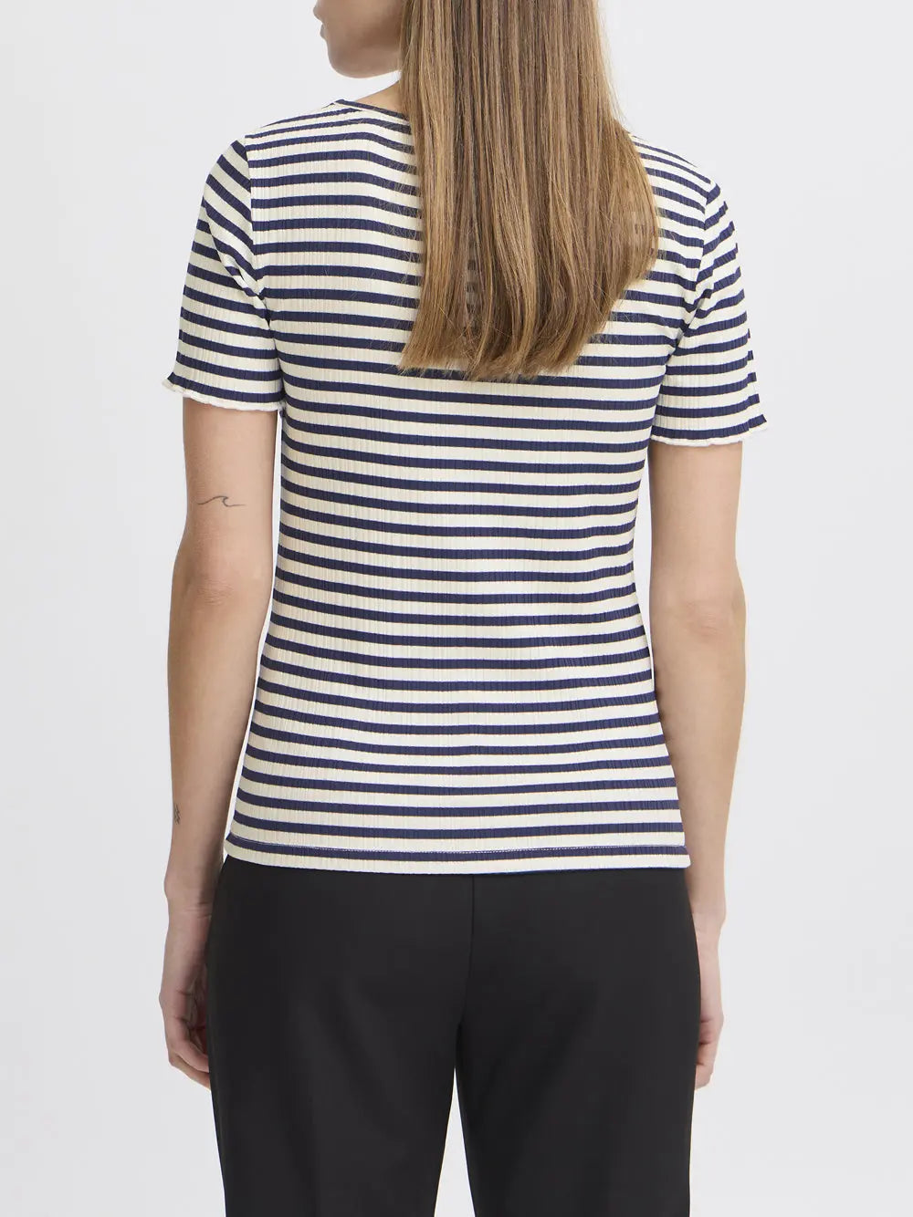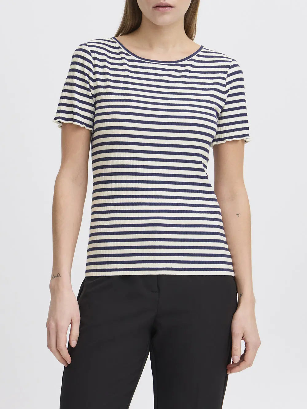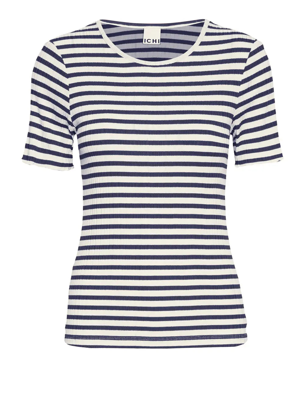 Questa t-shirt bianco donna di Ichi è un capo versatile per ogni guardaroba. Con un design moderno caratterizzato da righe blu su uno sfondo Total Eclipse, unisce comfort e stile grazie al suo tessuto di alta qualità e alla vestibilità modellata. Ideale per chi desidera un look casual ma curato.