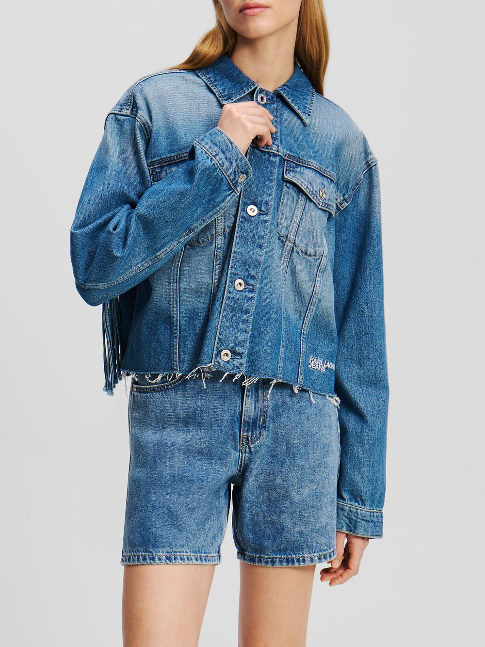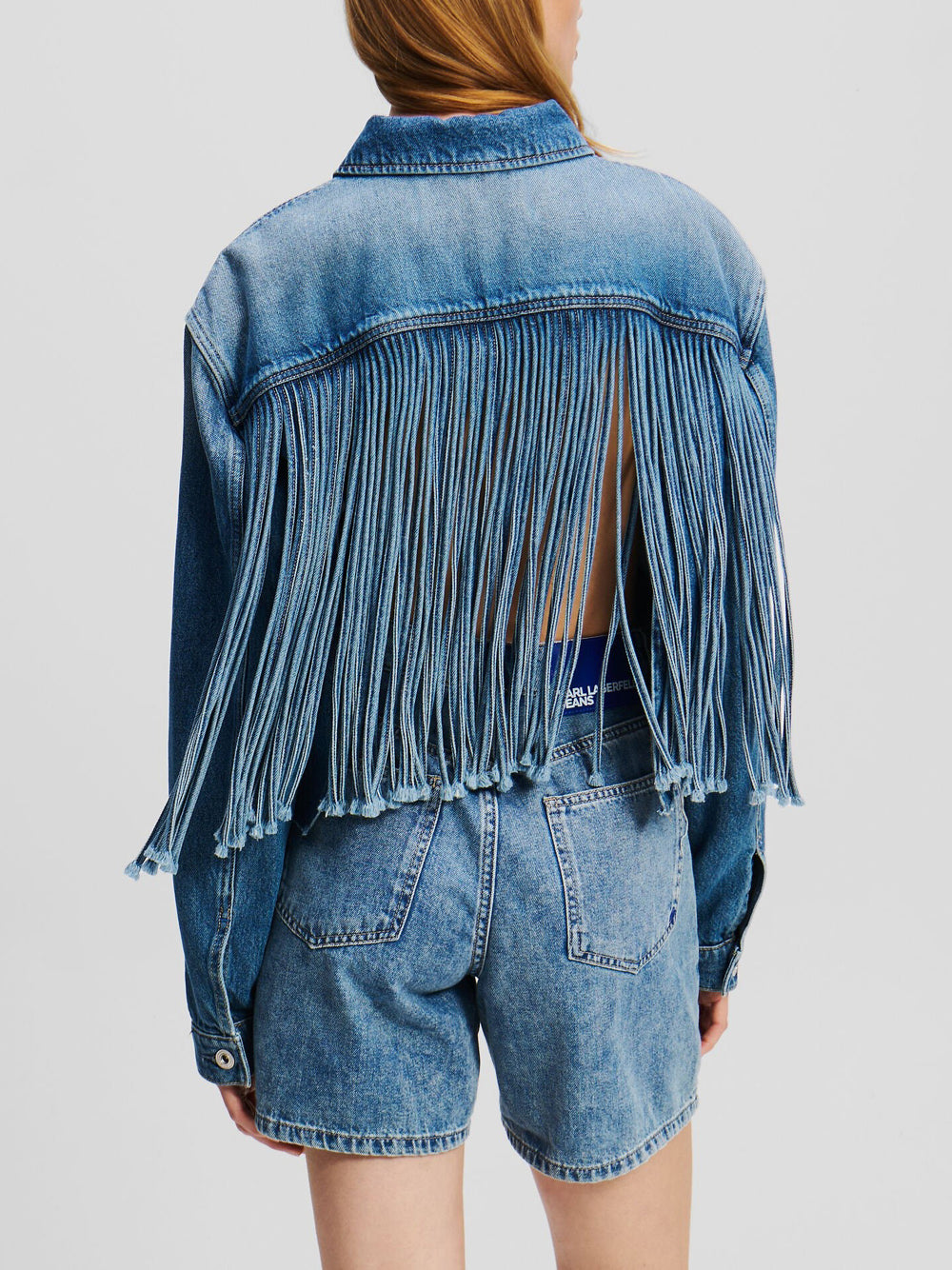- Aggiungi un tocco di stile al tuo look con questa giacca di jeans con frange dalla vestibilità rilassata.
