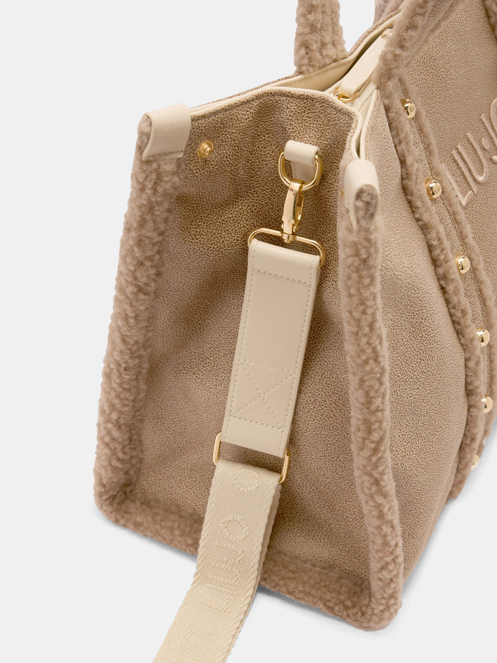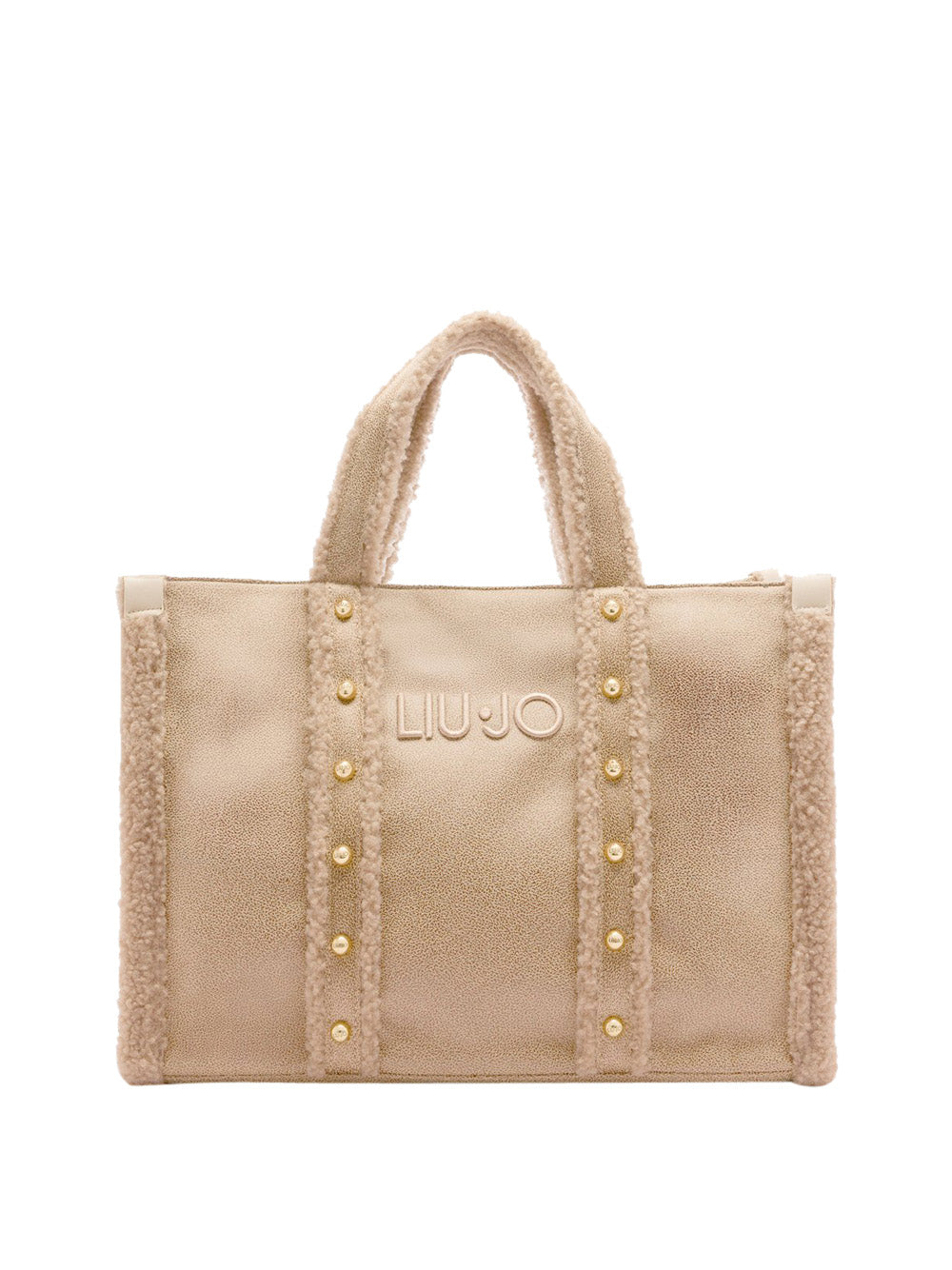 La borsa a mano di Liu Jo in beige naturale è perfetta per le donne moderne che amano lo stile casual ma ricercato. Realizzata in tessuto spalmato con dettagli in teddy e borchie applicate, è ideale sia per l'ufficio che per il tempo libero. La tracolla logata regolabile offre versatilità d'uso.