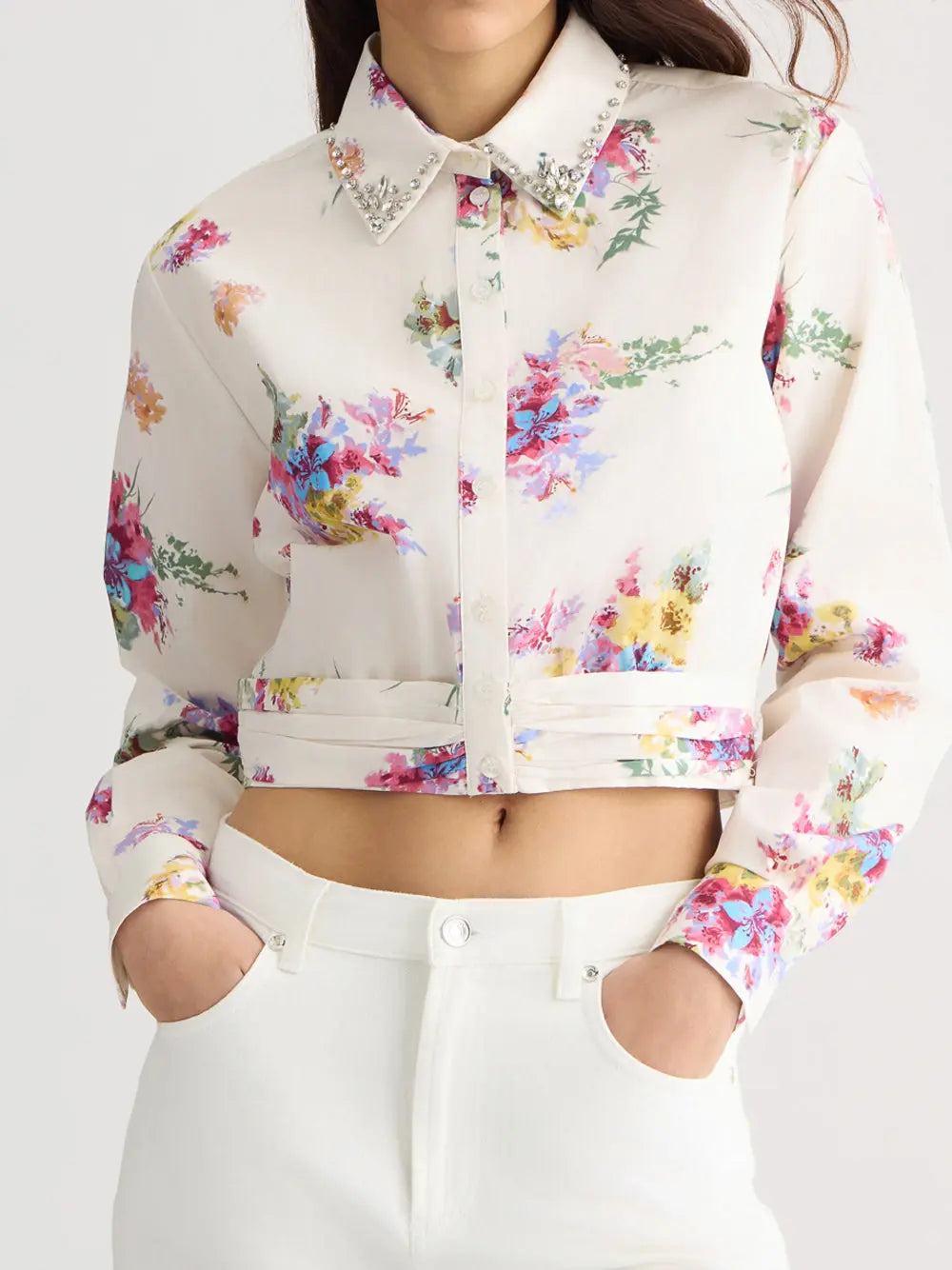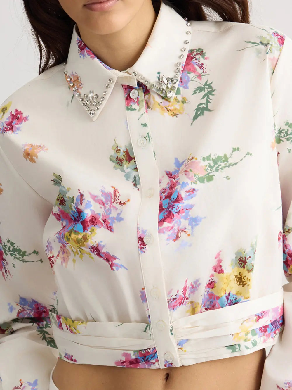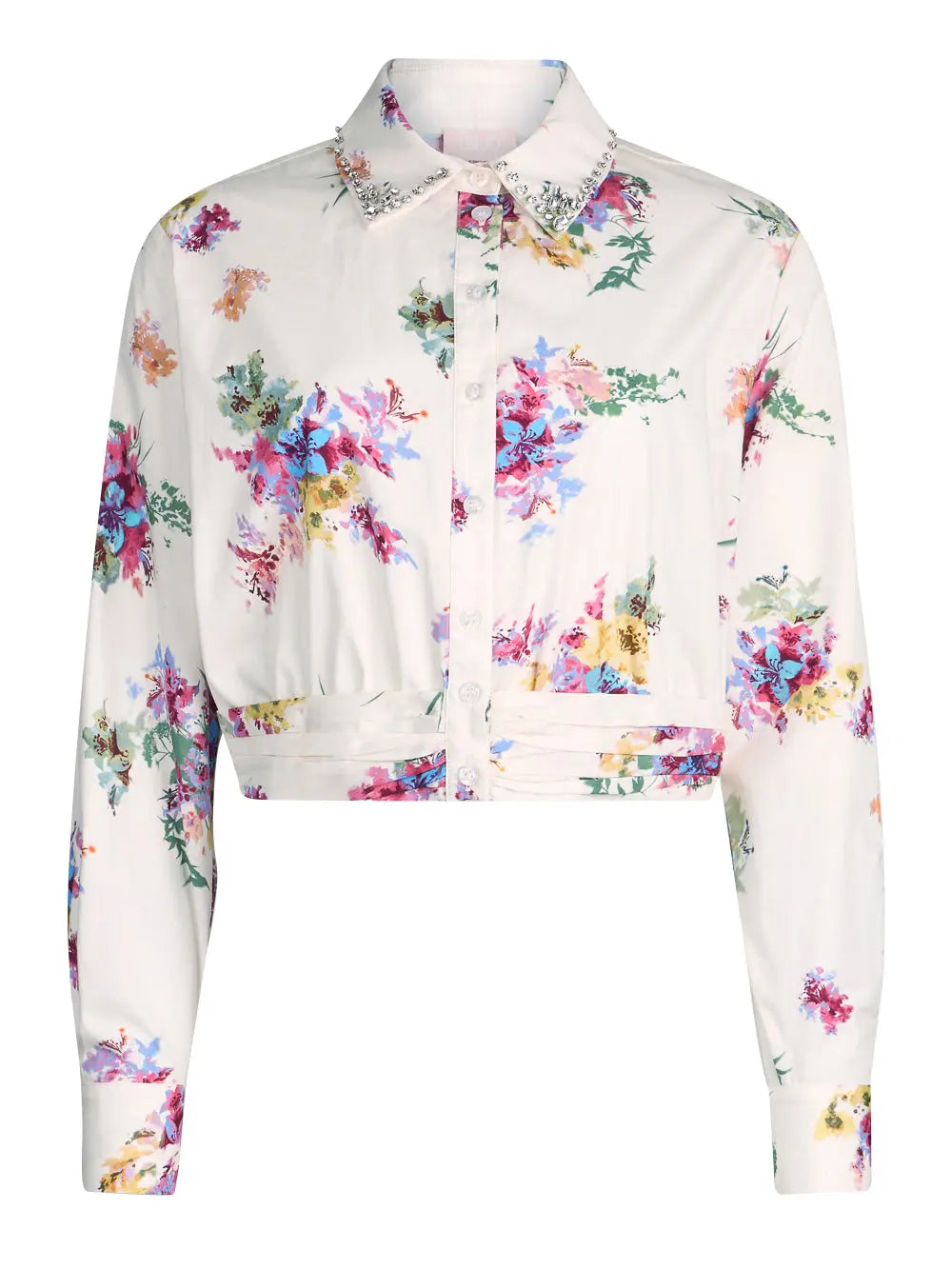 La camicia casual Liu Jo presenta un design sofisticato e femminile, caratterizzato da una splendida stampa floreale su sfondo bianco. Realizzata interamente in cotone di alta qualità, questa camicia offre un tocco di eleganza al guardaroba di ogni donna, grazie al colletto classico arricchito da strass scintillanti e al logo in metallo discreto sul retro.