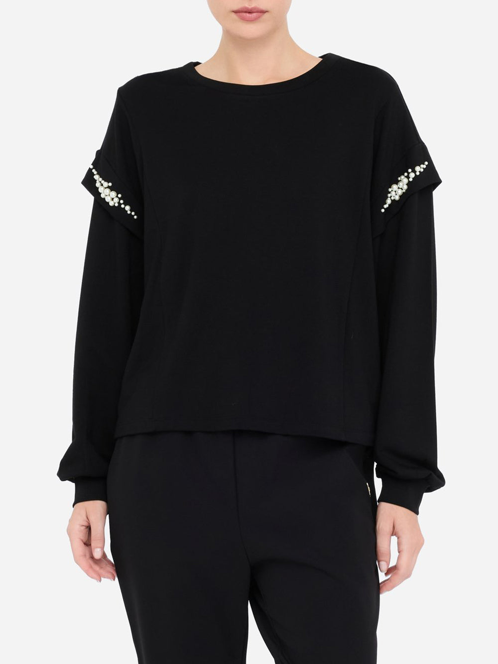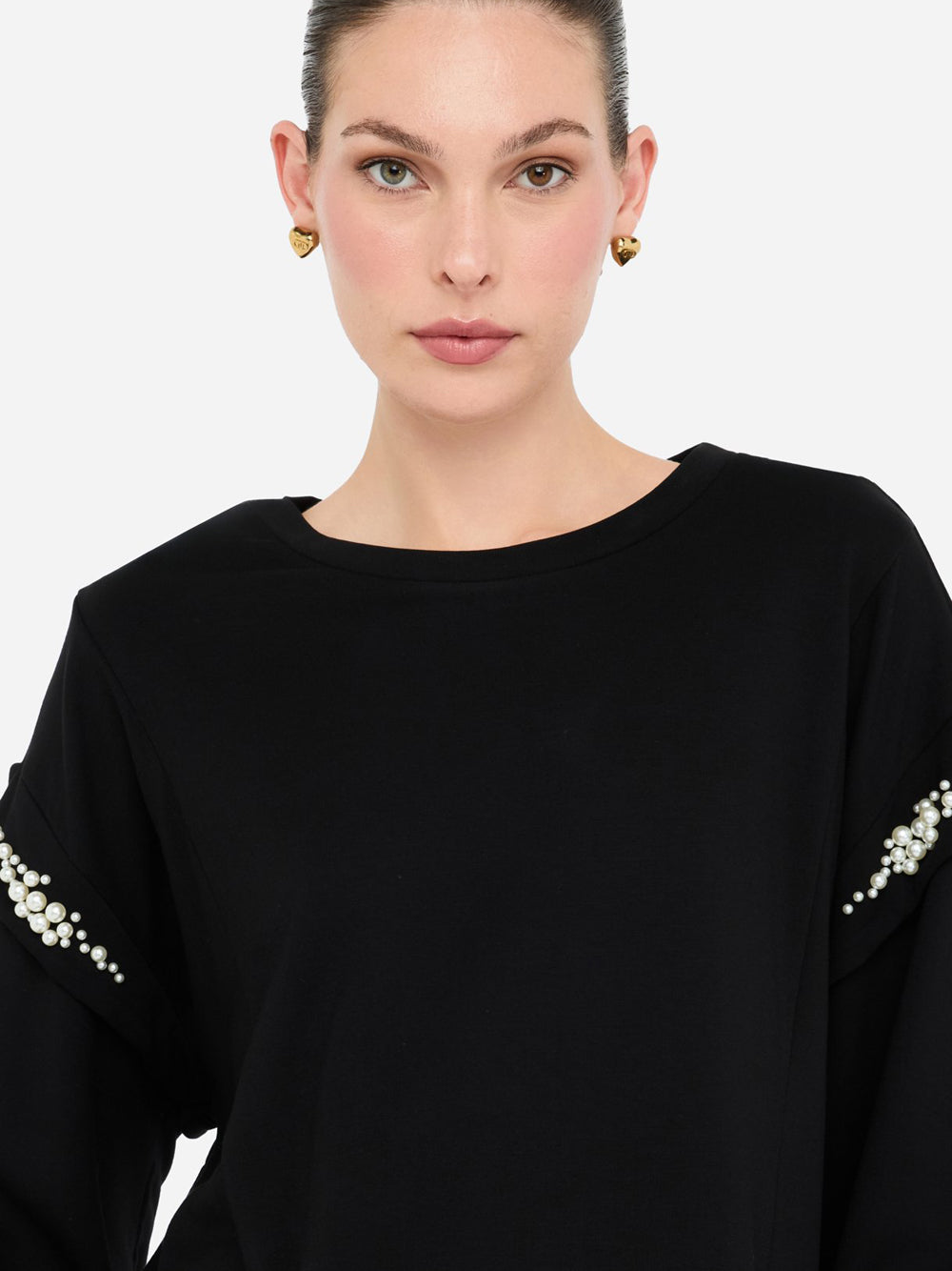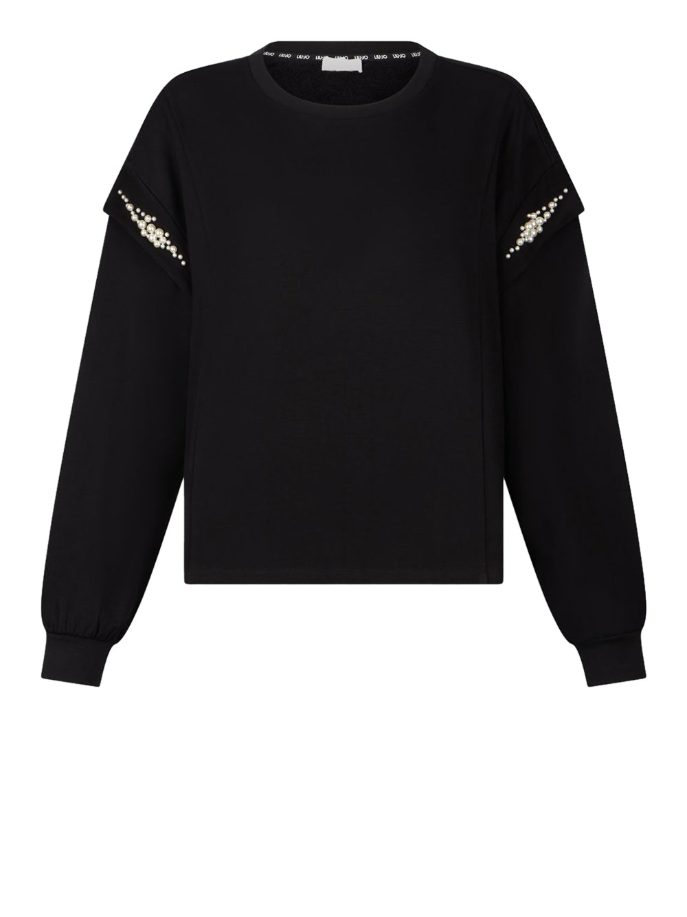 La felpa donna TF5153FS576 di Liu Jo è un capo essenziale in misto viscosa stretch con una silhouette elegante e moderna. Caratterizzata da perle applicate che donano un tocco di fascino femminile, presenta un classico taglio girocollo e il distintivo logo in metallo sul retro, rendendola perfetta per uno stile quotidiano chic.