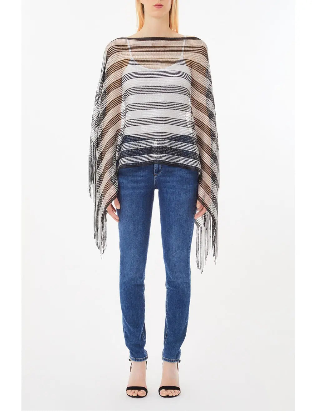 Il poncho bicolor lurex Liu Jo è l'accessorio ideale per arricchire il guardaroba femminile con un tocco di stile e originalità. Perfetto per coprirsi con eleganza nelle fresche serate primaverili, questo poncho si distingue per il suo aspetto raffinato e la tonalità nero che lo rende versatile per diverse occasioni.