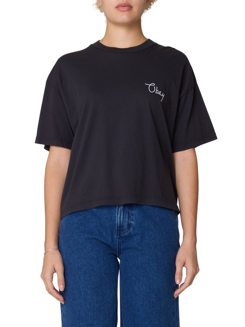La T-shirt Scripty Cities di Obey è un capo essenziale per il guardaroba di ogni donna. Realizzata in 100% cotone, questa maglietta a tinta unita esibisce un design casual con una vestibilità ampia e confortevole. Il colore nero, raffinato e versatile, permette di abbinare facilmente la t-shirt a diversi look e stili.
