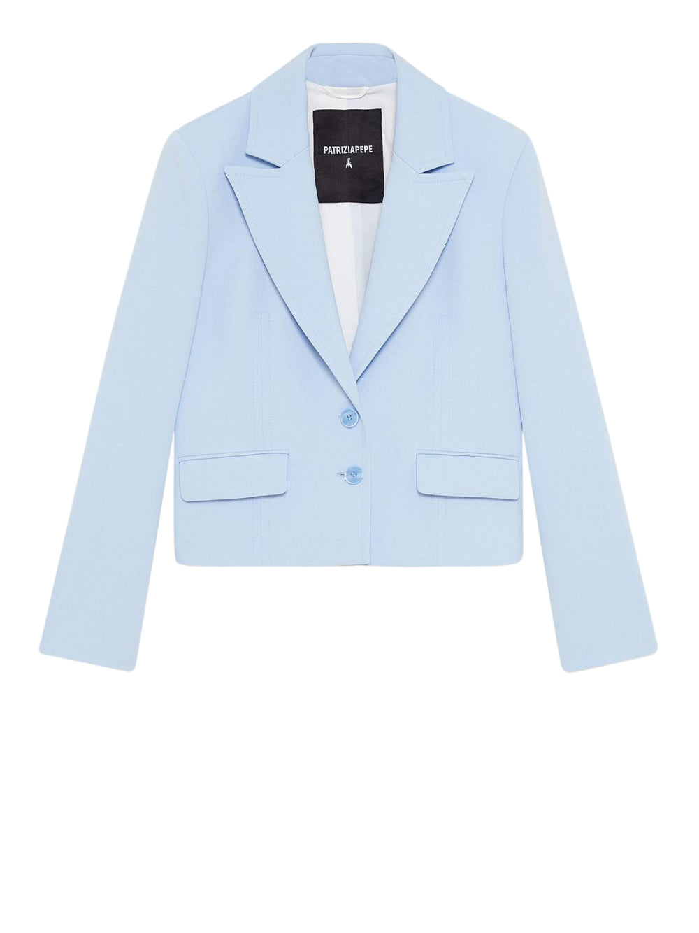 La giacca Patrizia Pepe "Shirting Sky" è una creazione raffinata e glamour, perfetta per la donna che desidera un look elegante e contemporaneo. Realizzata in tessuto crêpe, questa giacca si distingue per la sua vestibilità regolare e il dettaglio distintivo Fly sui polsi, conferendo un tocco di stile sofisticato.