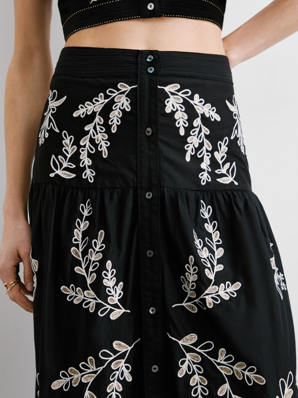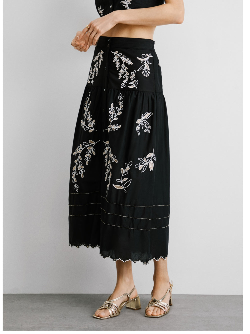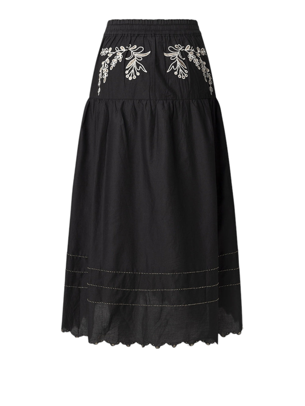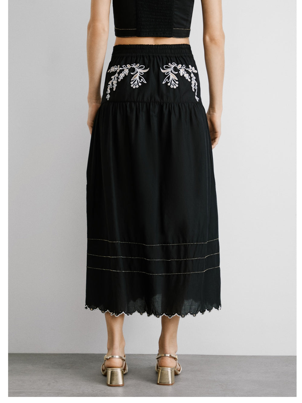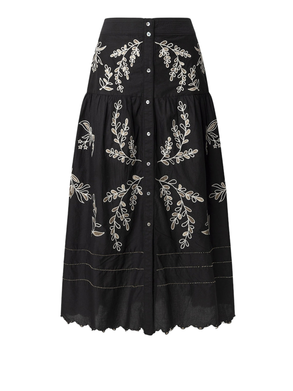 Scopri l'eleganza senza tempo con la gonna longuette Epsom di Pepe Jeans, un capo d'abbigliamento femminile che unisce stile e comfort. Realizzata in delicato tessuto popeline di cotone, presenta dettagli floreali ricamati all-over e un orlo smerlato con perline decorative, creando un look raffinato e versatile ideale per ogni occasione.