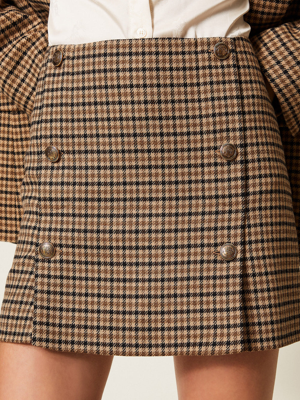 La Mini Gonna Twin Set è un capo elegante, perfetto per chi ama uno stile raffinato ma con un tocco casual. Realizzata in saia di misto lana con fantasia check e bottoni dorati a mezza sfera, è caratterizzata da una linea leggermente svasata che valorizza la silhouette femminile. La chiusura con zip e la placchetta con logo Oval T sul retro completano il design trendy.