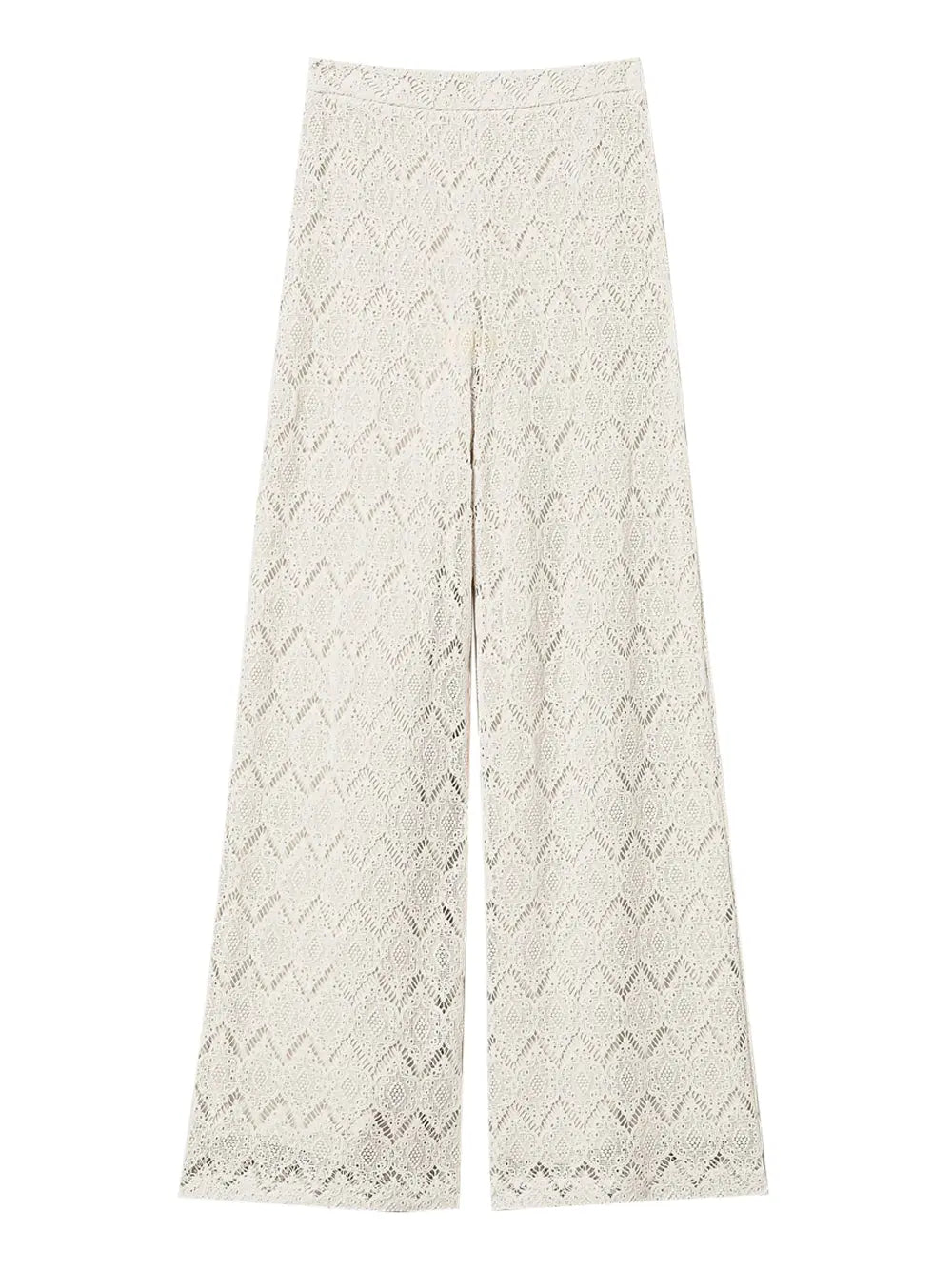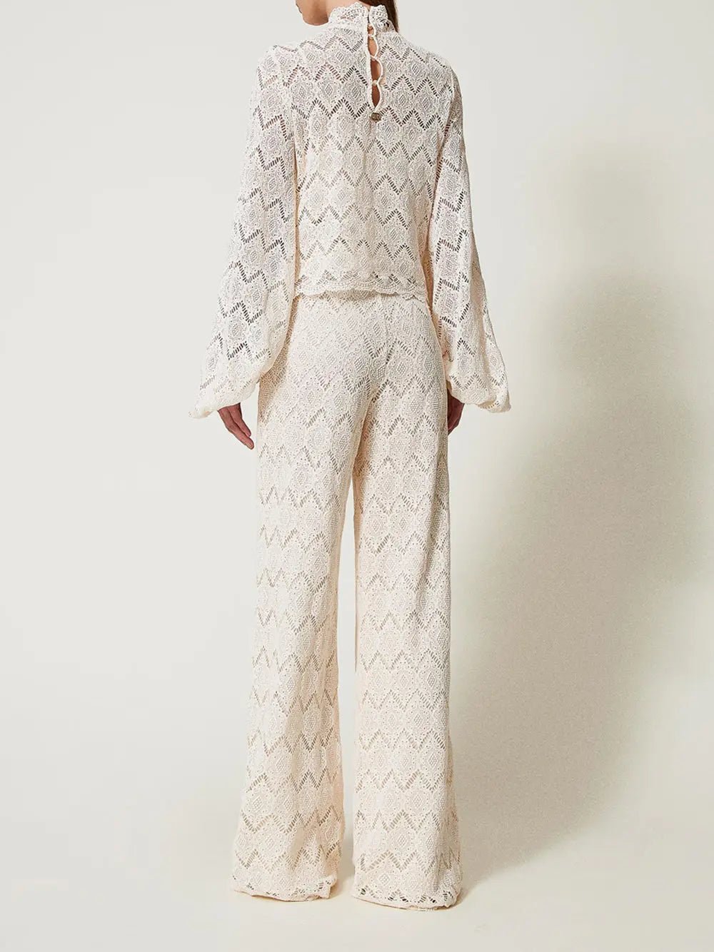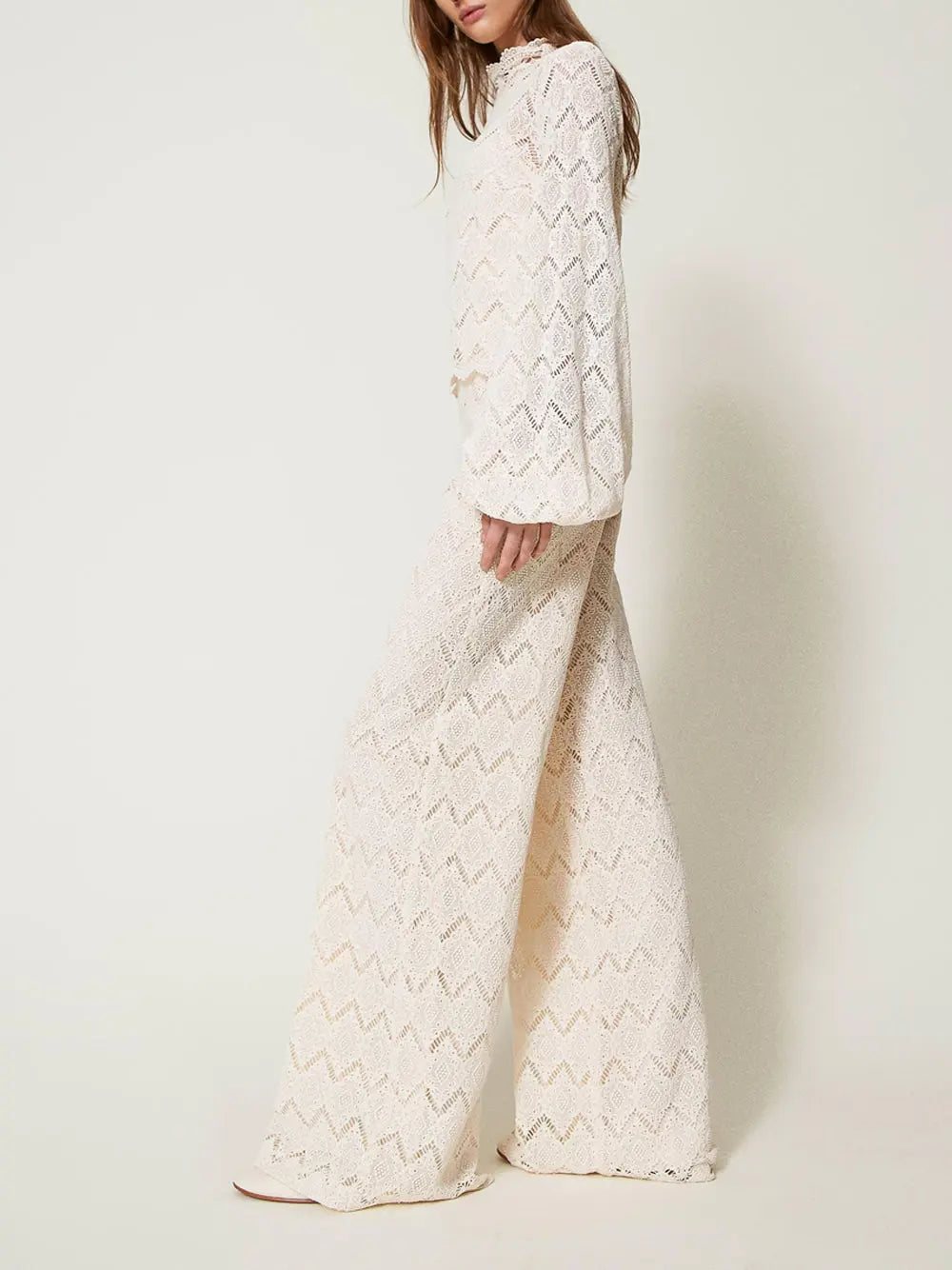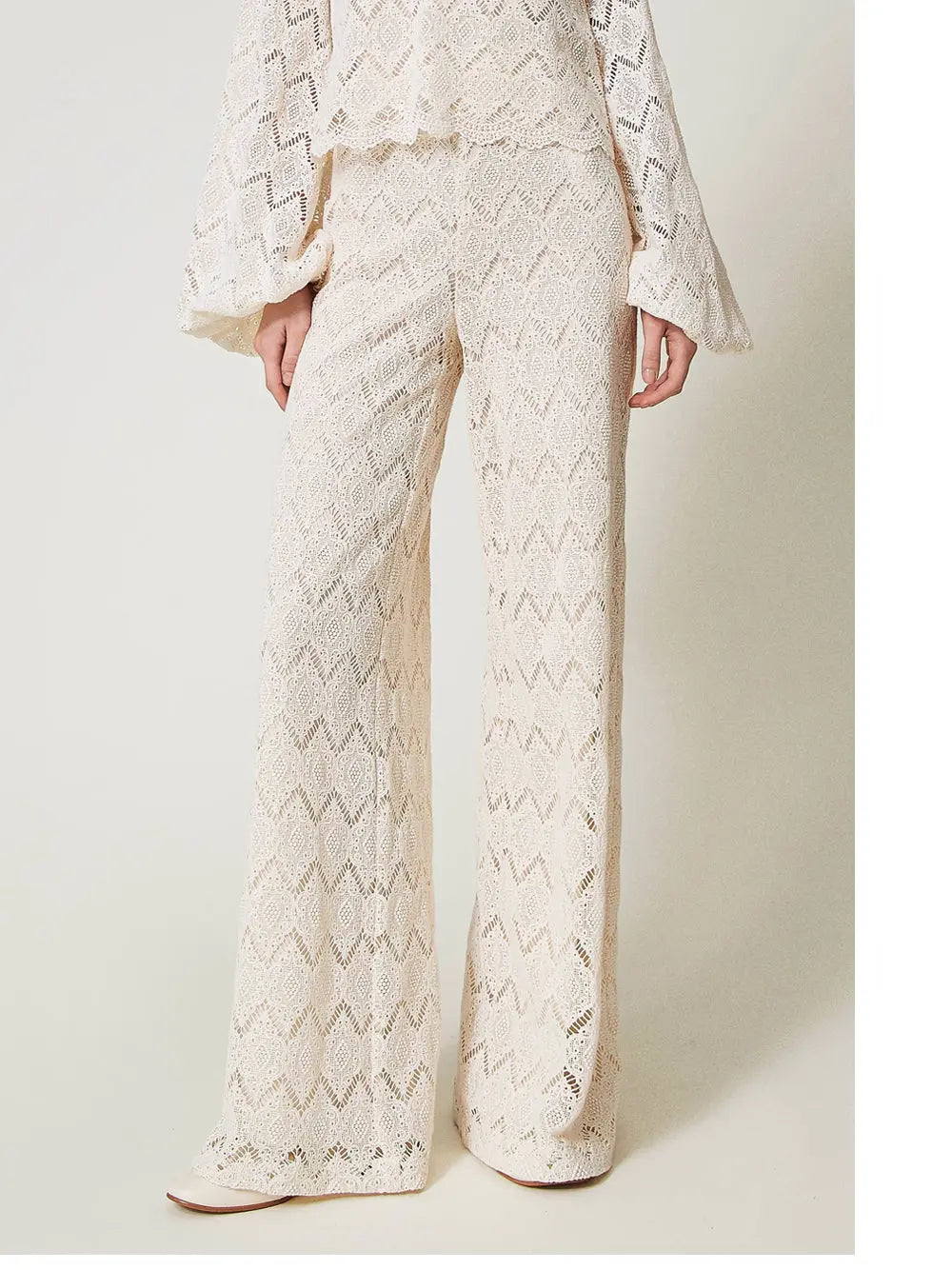 Lasciati conquistare dallo stile elegante e raffinato dei Pantaloni Palazzo Twin Set da Donna. Realizzati in pizzo macramè con disegno geometrico, presentano una vita alta e una chiusura con zip al fianco. Con la placchetta logo Oval T sul retro e la fodera in mussola di cotone, questi pantaloni sono l'ideale per un look sofisticato e di tendenza. Scegli la comodità e l'eleganza di Twin Set.