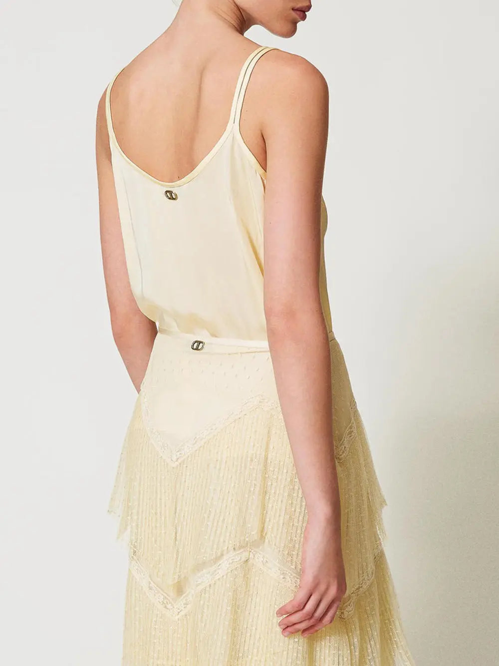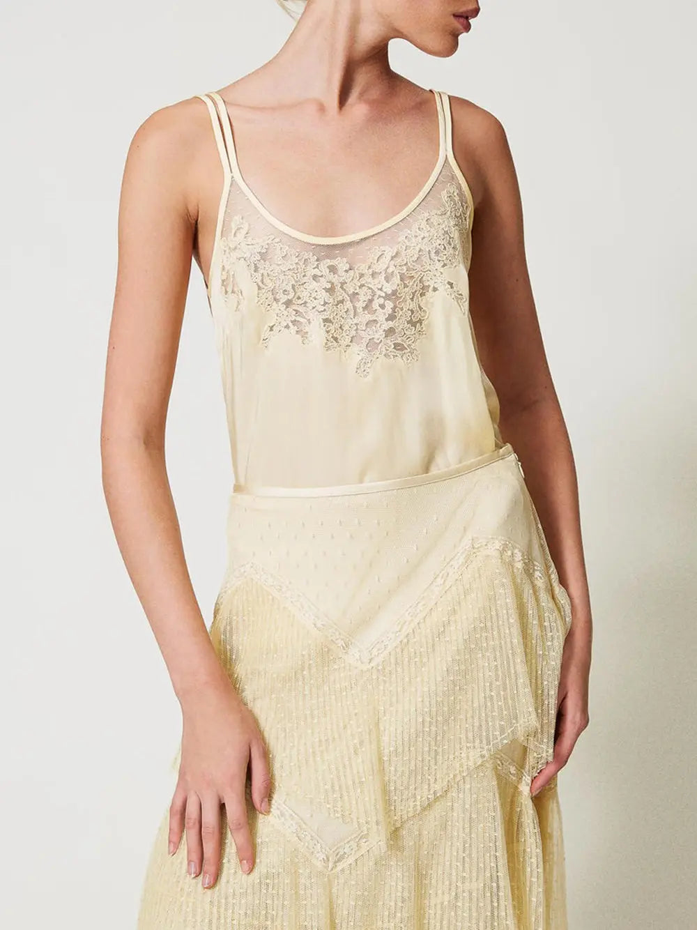 Il Top Donna 251TP2371 Vanilla - Avorio di Twin Set è un capo elegante e femminile, realizzato in raso di viscosa. Caratterizzato da un ricamo piazzato in trasparenza sullo scollo, intarsiato con delicati disegni di foglie e fiori su base di tulle in plumetis. Questo top con doppia spallina e scollatura ampia è la scelta perfetta per un look raffinato.