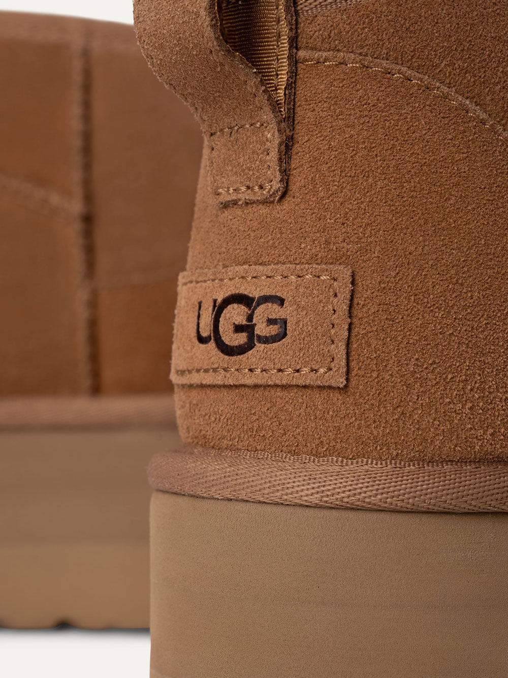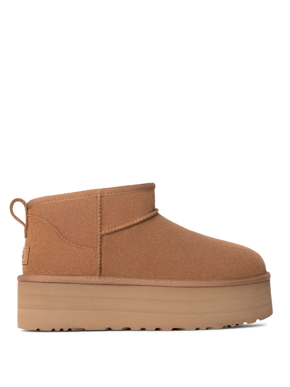 Stivaletto Ultra Mini Platform Donna 1135092 in tono Chestnut, una combinazione affascinante di eleganza e comfort, adatta allo stile casual delle donne moderne. Realizzati in pregiata pelle scamosciata e rifiniti con dettagli sofisticati, questi stivaletti Ugg incarnano uno spirito di novità senza tempo.